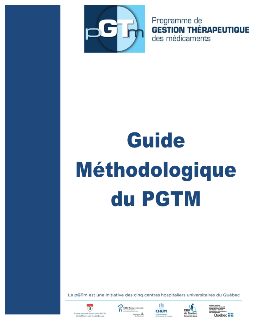 Modèle d’intervention clinique : Développement d’un modèle de transfert des connaissances qui vise la mise en place d’outils efficaces et utiles aux cliniciens pour assurer l’usage optimal des médicaments dans les centres hospitaliers universitaires (CHU) du Québec. Il est élaboré et joint aux différents travaux réalisés par le PGTM.
