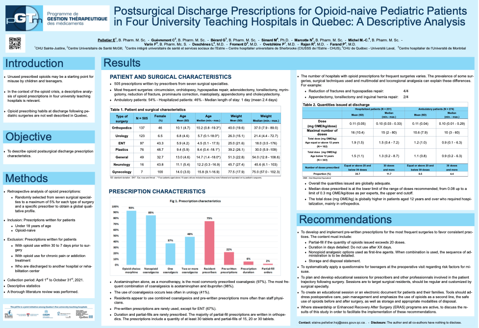 Postsurgical Discharge Prescriptions for Opioid-naive Pediatric Patients in Four University Teaching Hospitals in Quebec: A Descriptive Analysis présentée dans le cadre du congrès de la Société Canadienne des Pharmaciens d’Hôpitaux (SCPH) à Niagara Falls – Avril 2024